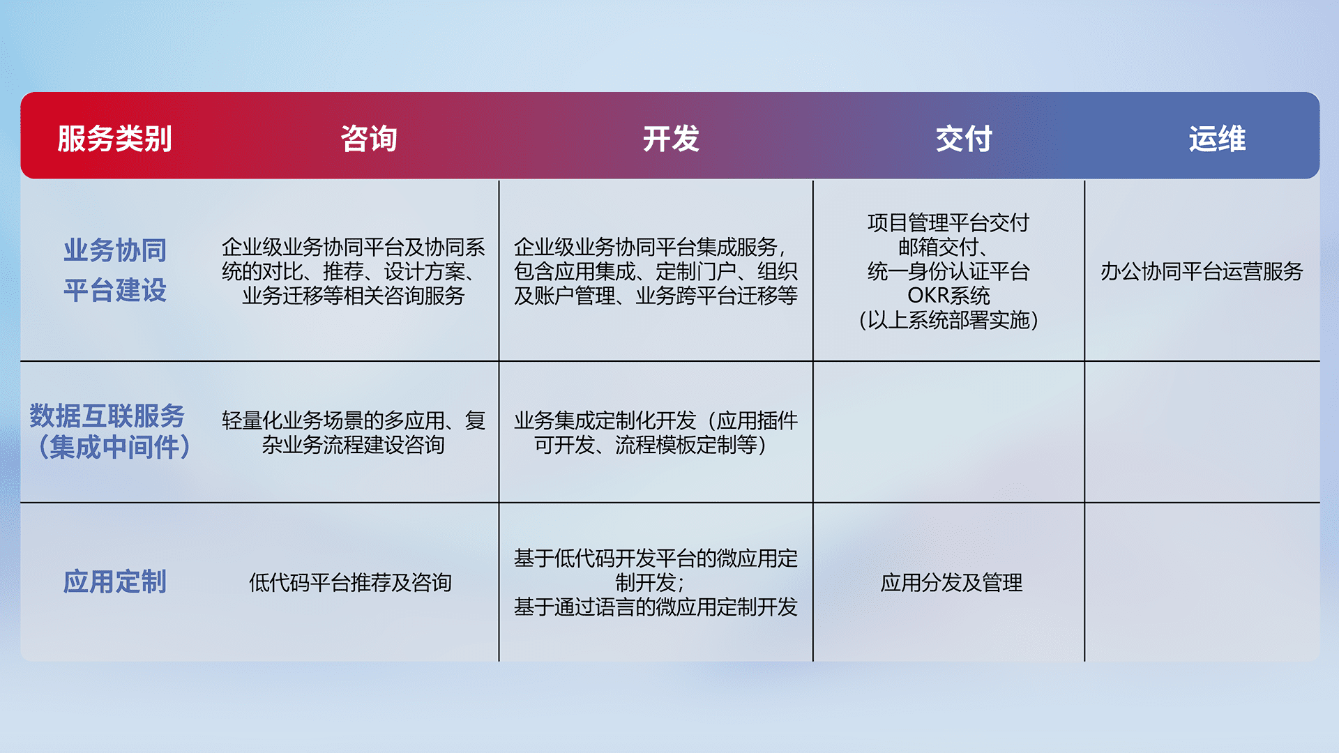 针对钉钉、、、、企微、、IDaas等平台级产品提供产品的规划、、、方案、、、交付、、、、定制化开发等服务,,,,实现如统一协同办公、、智能客户服务、、、、混合会议管理、、、智能数据查询、、、等业务场景,,,,实现数字化转型。。